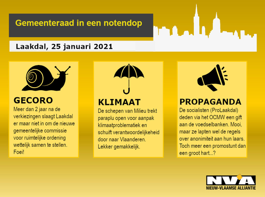 - Laakdal roept haar burgers op mee op om het klimaat te redden, daarom werd de actie Klimaatmakers opgestart waarbij sprekers duiding komen geven bij de problematiek en concrete aanbevelingen maken. Op zich een nobel initiatief. N.a.v. hiervan vroeg Niels Vermeulen, fractieleider voor N-VA, wat de gemeente binnen de eigen bevoegdheid gaat ondernemen ter zake. Volgens Benny Smets, socialistische schepen voor Klimaat, moet Vlaanderen eigenlijk alles doen. Zo trekt hij de paraplu open en schuift de verantwoordelijkheid door naar minister Demir. Dat is toch iets te gemakkelijk niet? Vanaf september zou de gemeente toch in gang schieten en eens gaan bekijken wat ze al dan niet gaan doen. N-VA Laakdal houdt de vinger aan de pols.